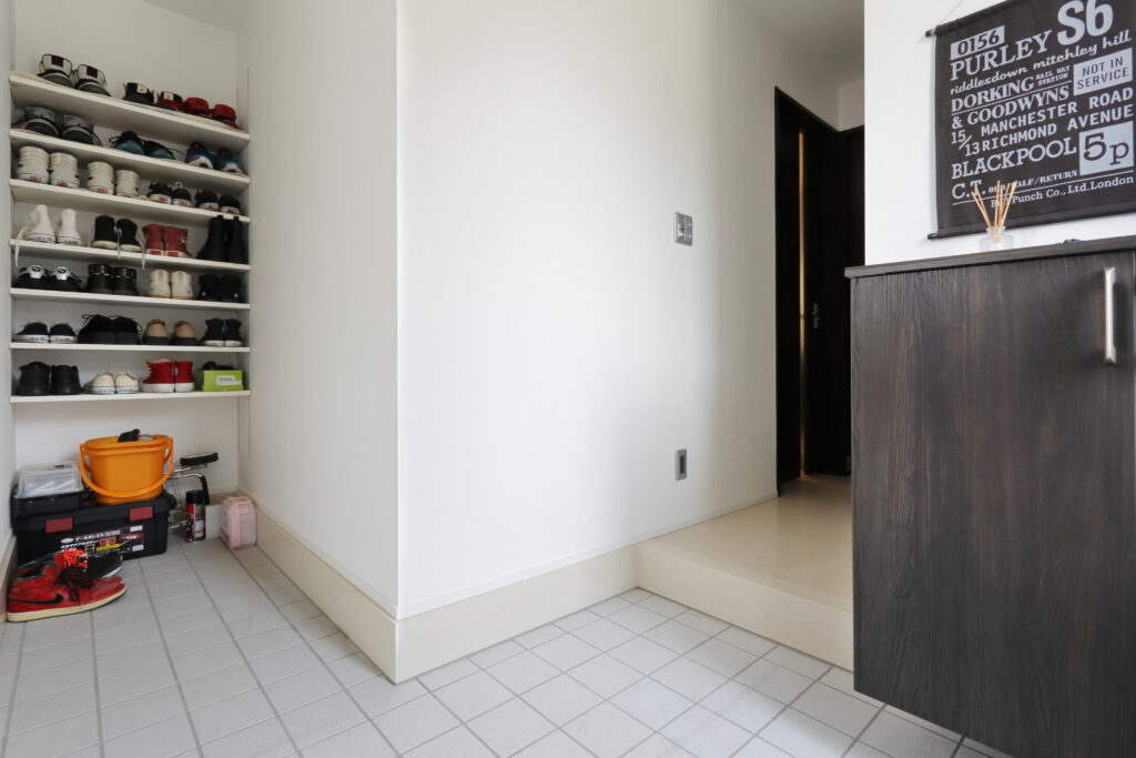 土間収納は広めに設けたので、靴だけでなくアウトドア用品やベビーカーなどを置いても十分な広さ。