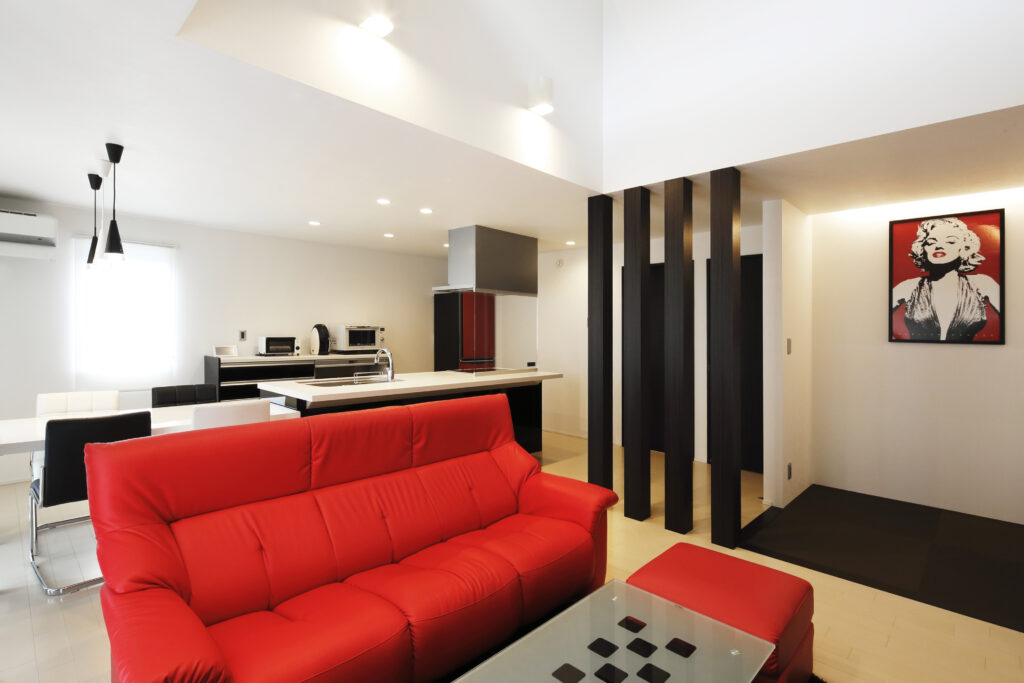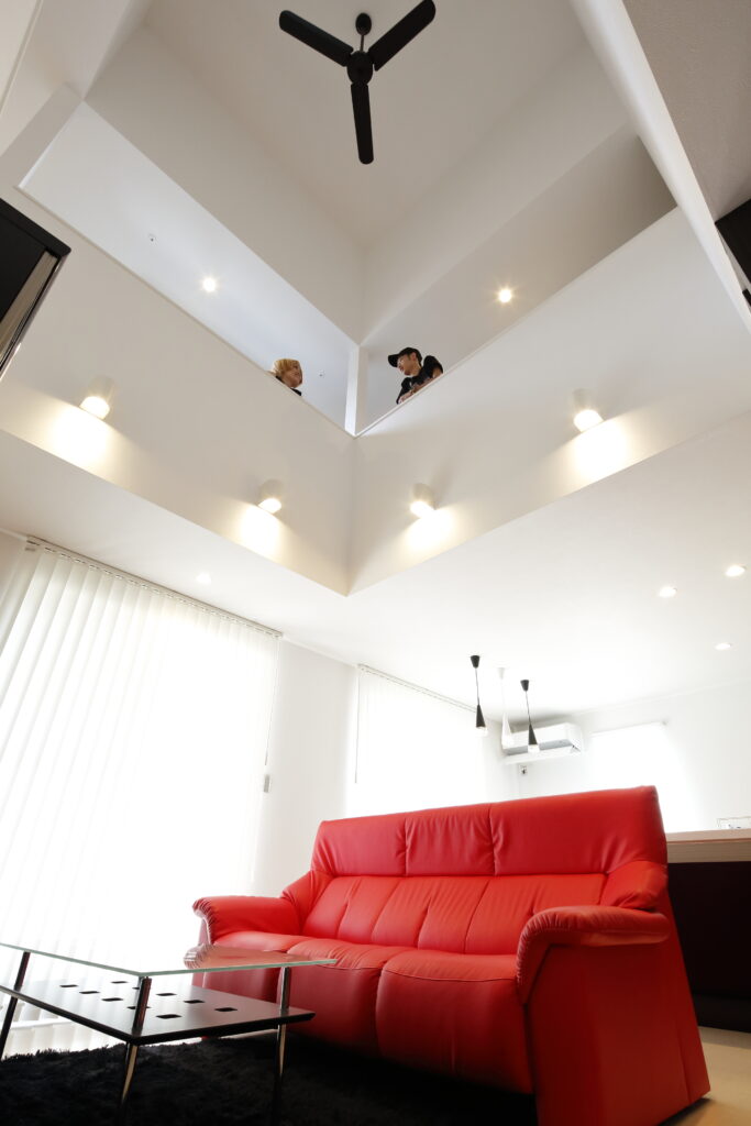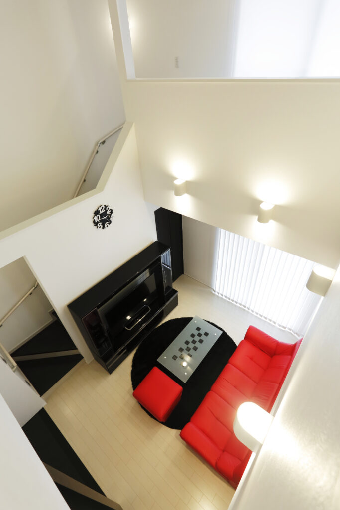 6m超の吹抜けは、爽快の一言です!他の家と一緒では面白くないので、内装にもかなりこだわり、白、黒、赤の3色で統一してスタイリッシュな雰囲気を演出しました。