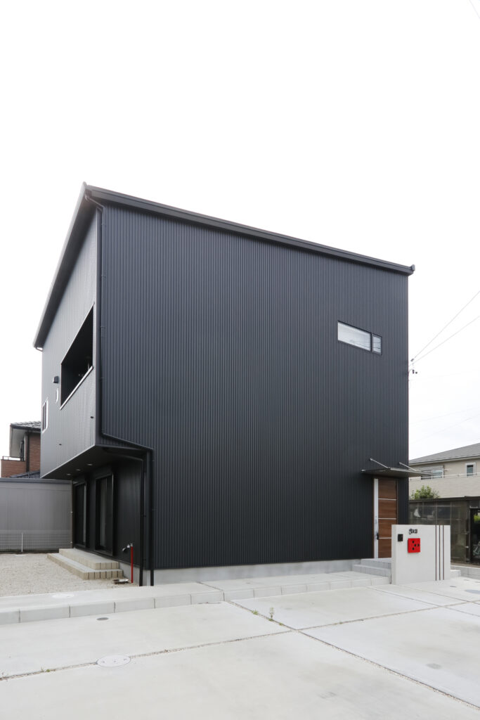 黒いガルバリウムが存在感のある外観。アッパーライトで照らされる夜の外観も美しい建物になりました。