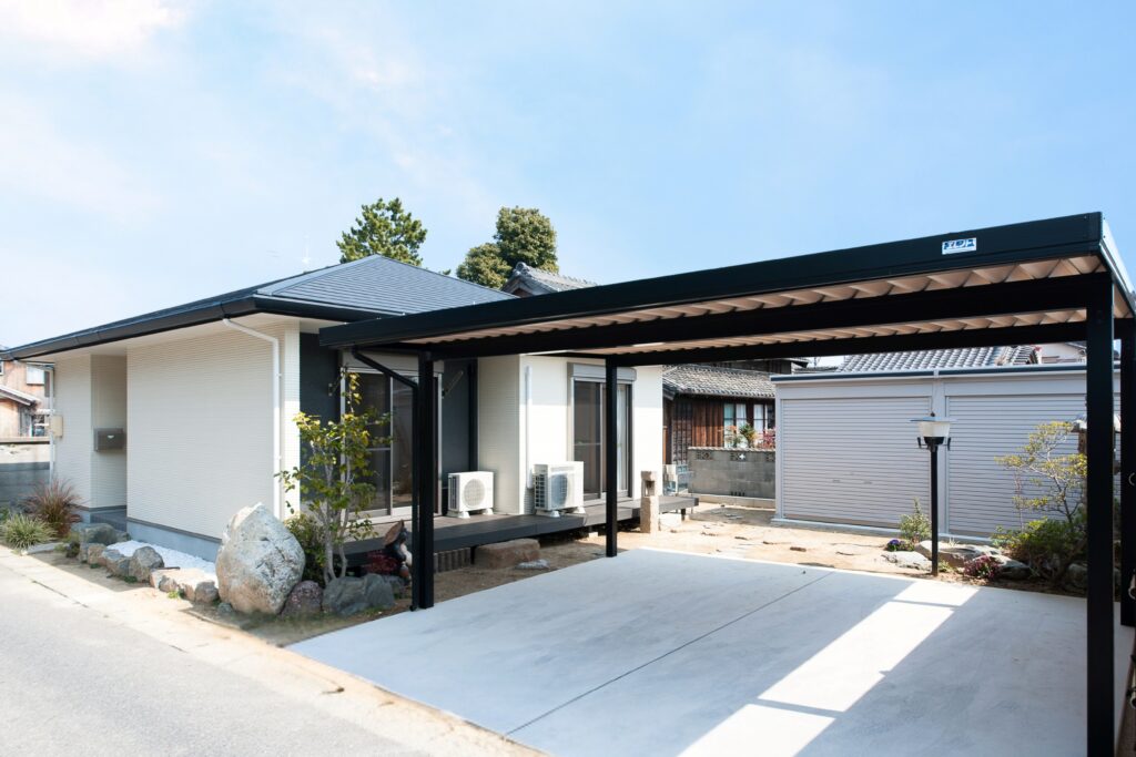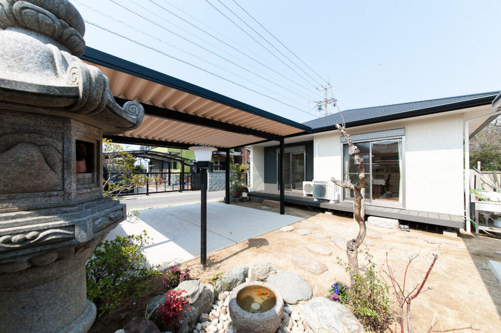 外観はまわりの景観に馴染むよう設計。お庭はご主人の趣味で制作中です。