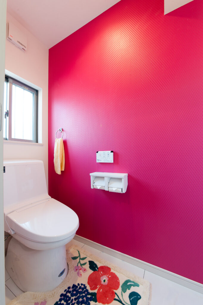 トイレは赤のアクセントクロスが印象的なデザイン。シンプルな中にも遊び心があり、日常の中でちょっと気分が上がる空間に仕上がっています。