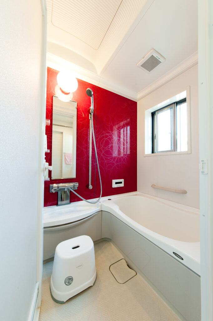 浴室にも一部に赤を取り入れ、LDKのキッチンカラーとさりげなくリンク。統一感がありながらも、少しモダンで華やかな雰囲気に。