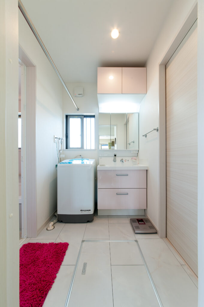 淡いピンクの洗面台がポイントの洗面脱衣室。天井には物干しが設けられ家事動線もスムーズ。実用性と美しさが両立した、心地よい空間です。