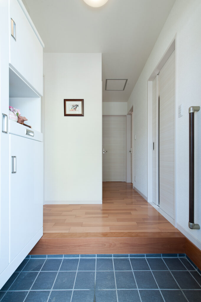 2帖の玄関も明るい色使いと奥行きをもたせて広く演出。