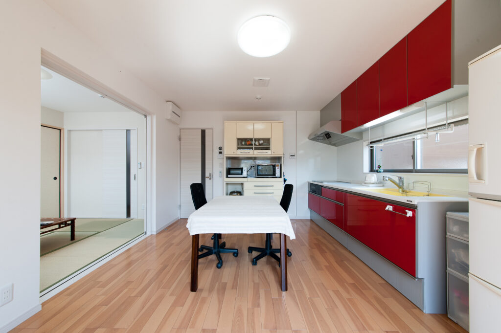 赤のキッチンが印象的なLDKは、家の中心となる明るく開放的な空間。壁付けのキッチンにすることで視界がすっきりと広がり、ダイニングテーブルを中央にゆったり配置。