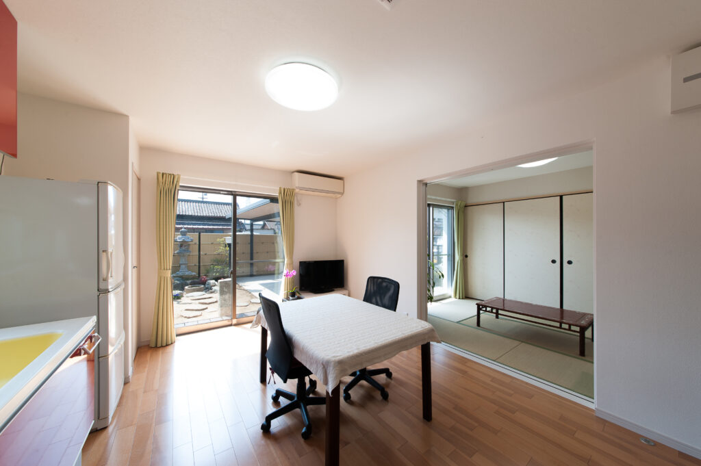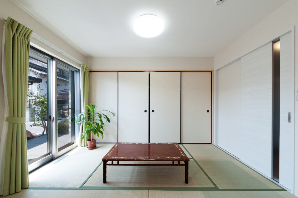LDKと引き戸で繋がる和室は、畳の香りに包まれた癒しの空間。襖の奥にはお仏壇が隠れるように設計され、生活感を抑えつつも大切な想いを丁寧に受け継ぐ工夫がされています。