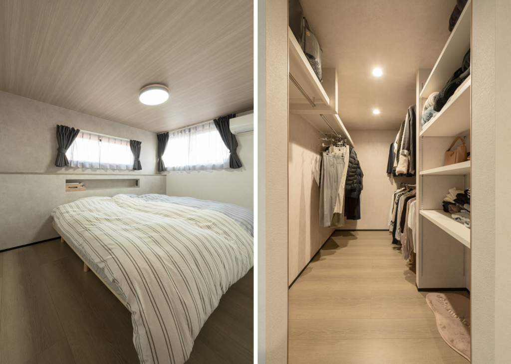 約3帖のウォークインクローゼットは、衣類や小物類をすべて収納できるよう可動棚を設置しました。