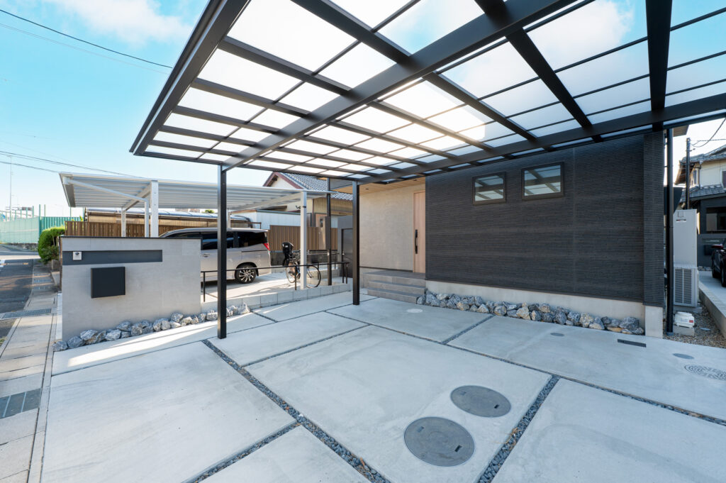 カーポートと一体で計画した広い駐車スペースは、日々の使い勝手を高めつつスマートな印象を演出。