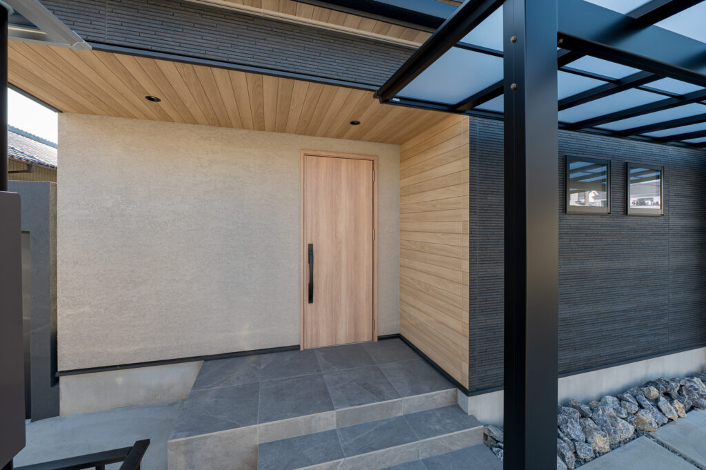 落ち着いた濃色サイディングと軒から壁へと繋がる木目が印象的なエントランス。