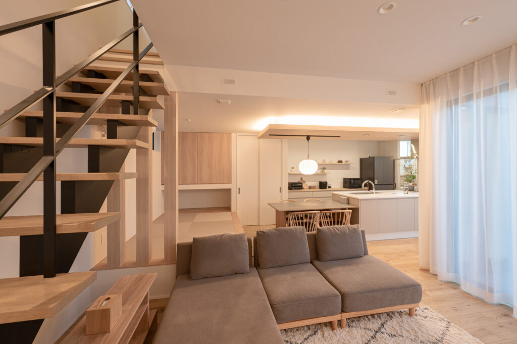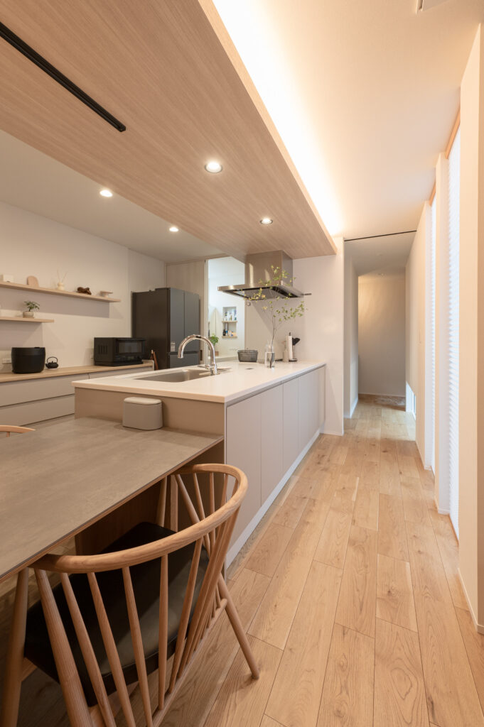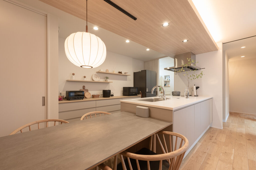 木の風合いとやわらかなグレートーンが美しく調和したLDKは、家族が自然と集まりたくなる落ち着いた心地よい空間。