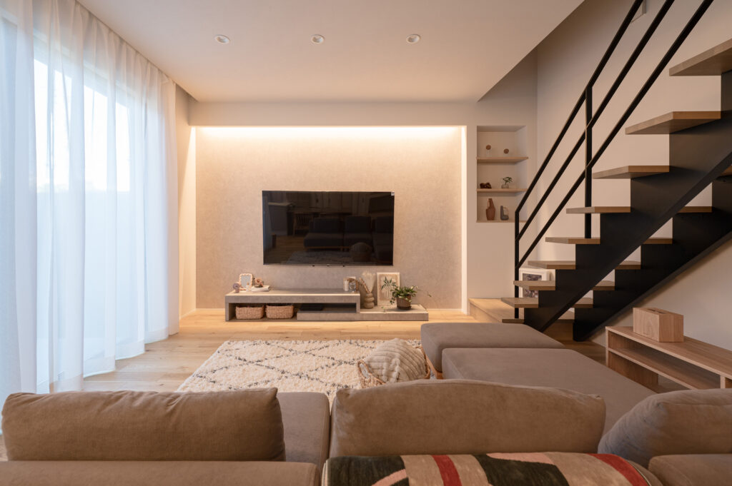 テレビ周りのふかし壁+間接照明が奥行を生みだし、シンプルの中にも温かい光と木が寄り添うリビング。