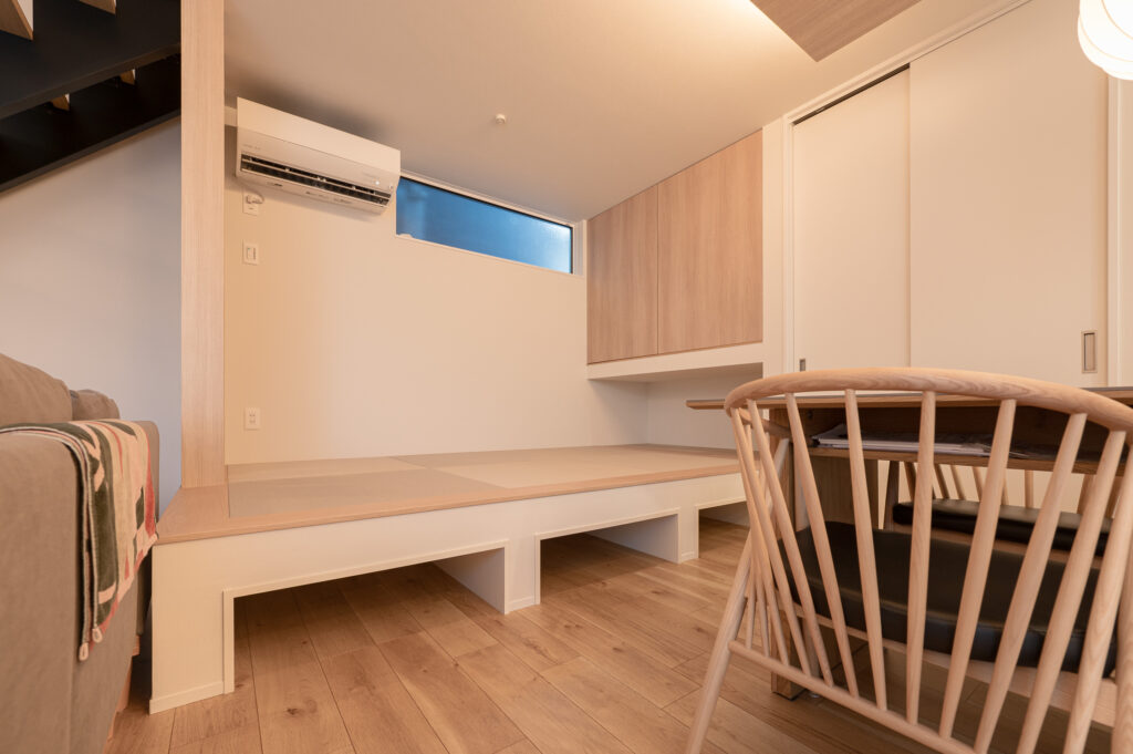 小上がりの畳コーナーは、浮かせて造作した壁面収納で見た目もスッキリ。
