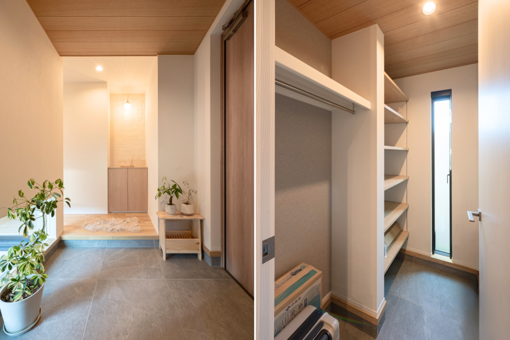 優しい木目天井と大判タイルの質感が調和した落ち着きのある玄関ホール。地窓からは自然光が柔らかく差し込むみ、ほっと気持ちが和らぎます。